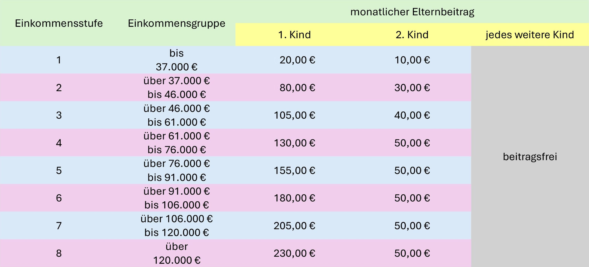 Die monatlichen Kosten errechnen sich nach dem jeweiligen Jahreseinkommen der Eltern.