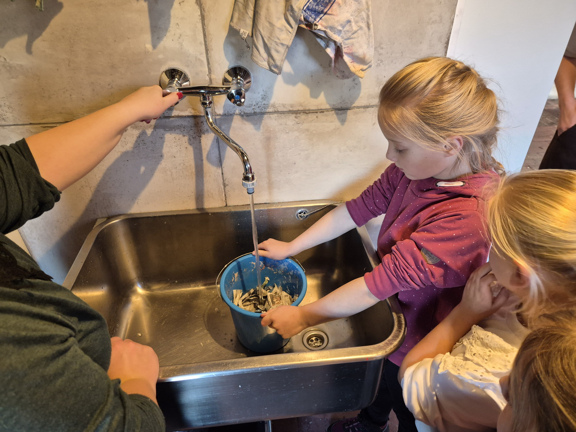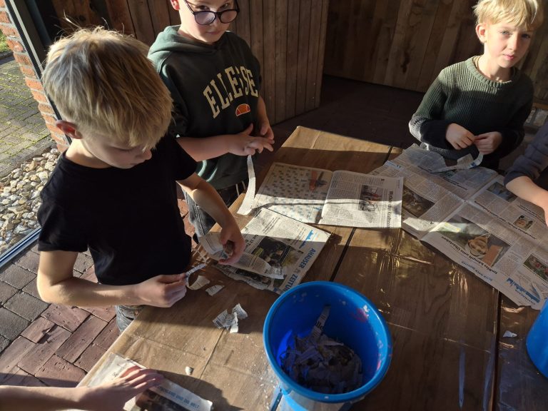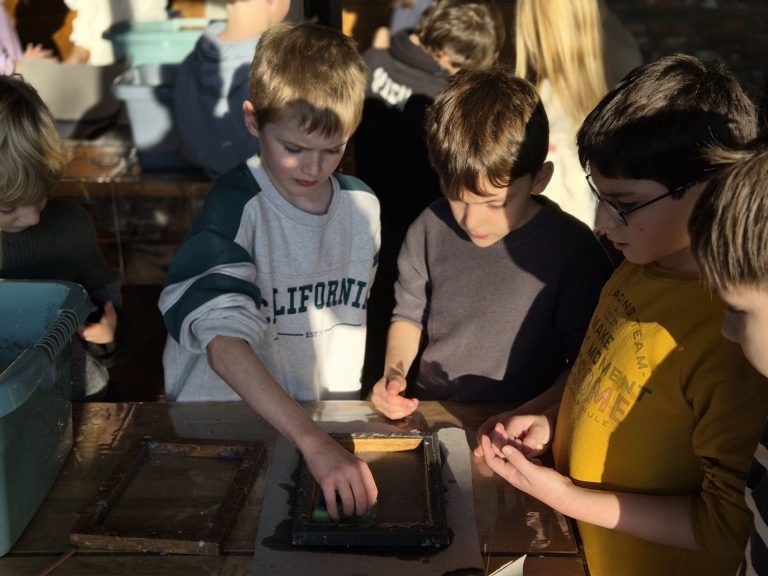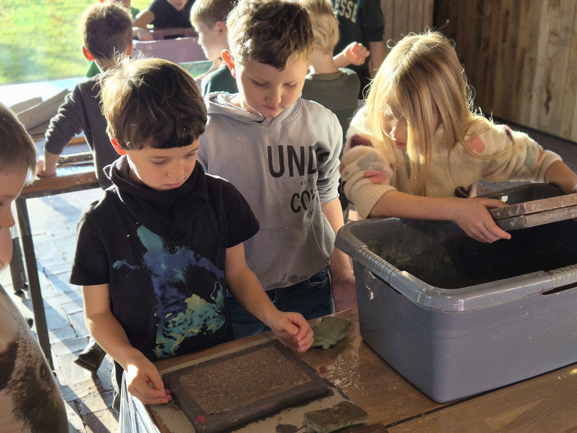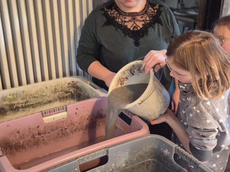 Der Tag in Gescher endete damit, dass die Kinder selbst Papier herstellten, und zwar aus mitgebrachtem Altpapier. Der Kreativität beim Schöpfen des Papiers waren kaum Grenzen gesetzt, da durch die geschickte Zugabe von farbigen Resten schöne neue Töne entstanden. Mit weihnachtlichen Servietten gelang einigen sogar ein ganz besonderes Motiv.
