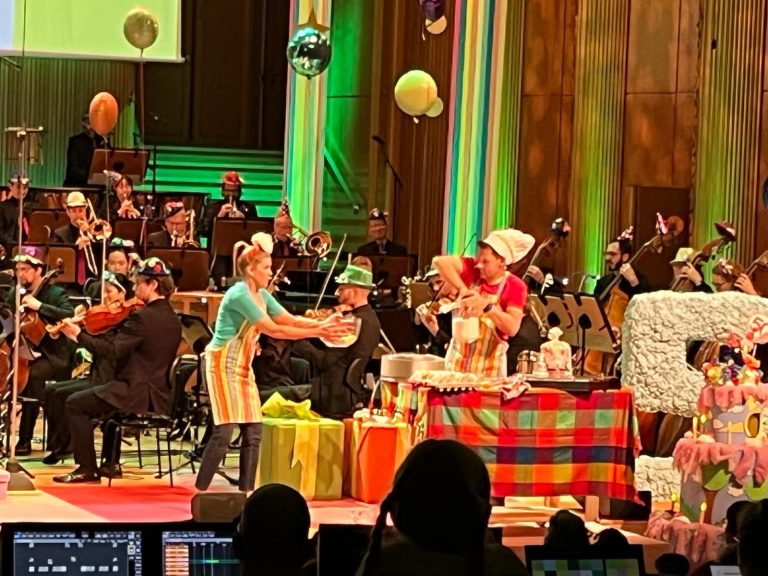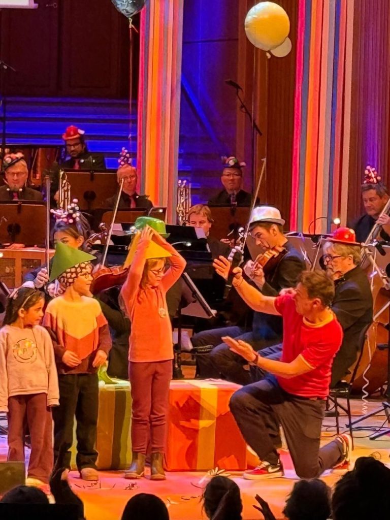 Was gehört zu einem Geburtstag? Dekoration! Die Musiker*innen sollten dabei helfen. Der Fagottspieler hat zum Beispiel mit seinem Instrument Luftschlangen entrollt, ein Trompetenspieler mit dem Mundstück einen Luftballon aufgeblasen.