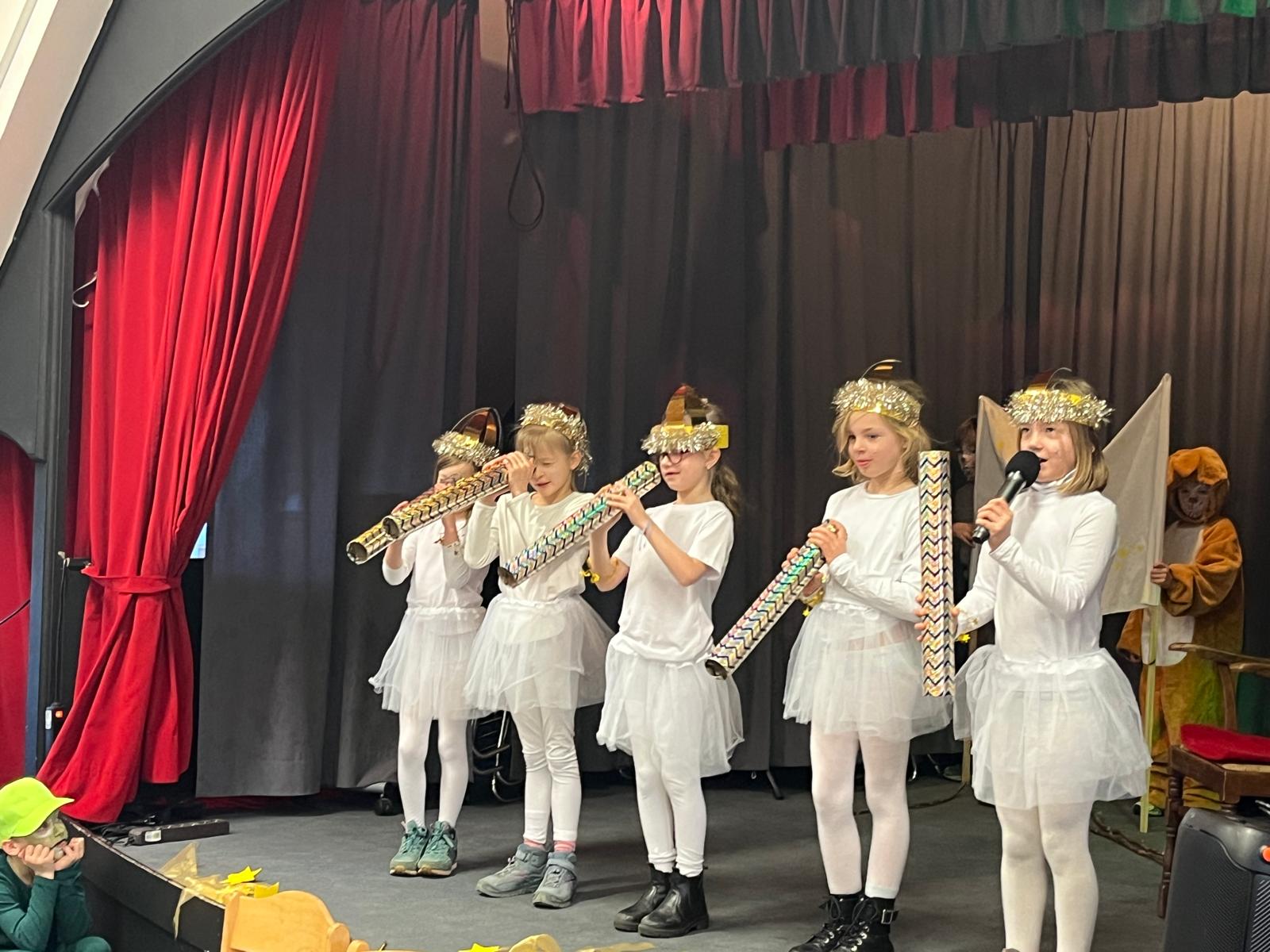 Nun kam die Zeit für die finale Aufführung vor großem Publikum. Den Gesang lieferte natürlich der schuleigene Chor. Unter der Leitung von Anngret Bennink und Angela Teigelkötter unterstützten mehr als 50 Kinder die musikalischen Elemente der Darbietung. Und der Einsatz lohnte sich: Mehrere Hundert Gäste – darunter Eltern, Großeltern, Geschwister und Freunde – waren gekommen, um das Ergebnis des monatelangen Übens zu erleben.