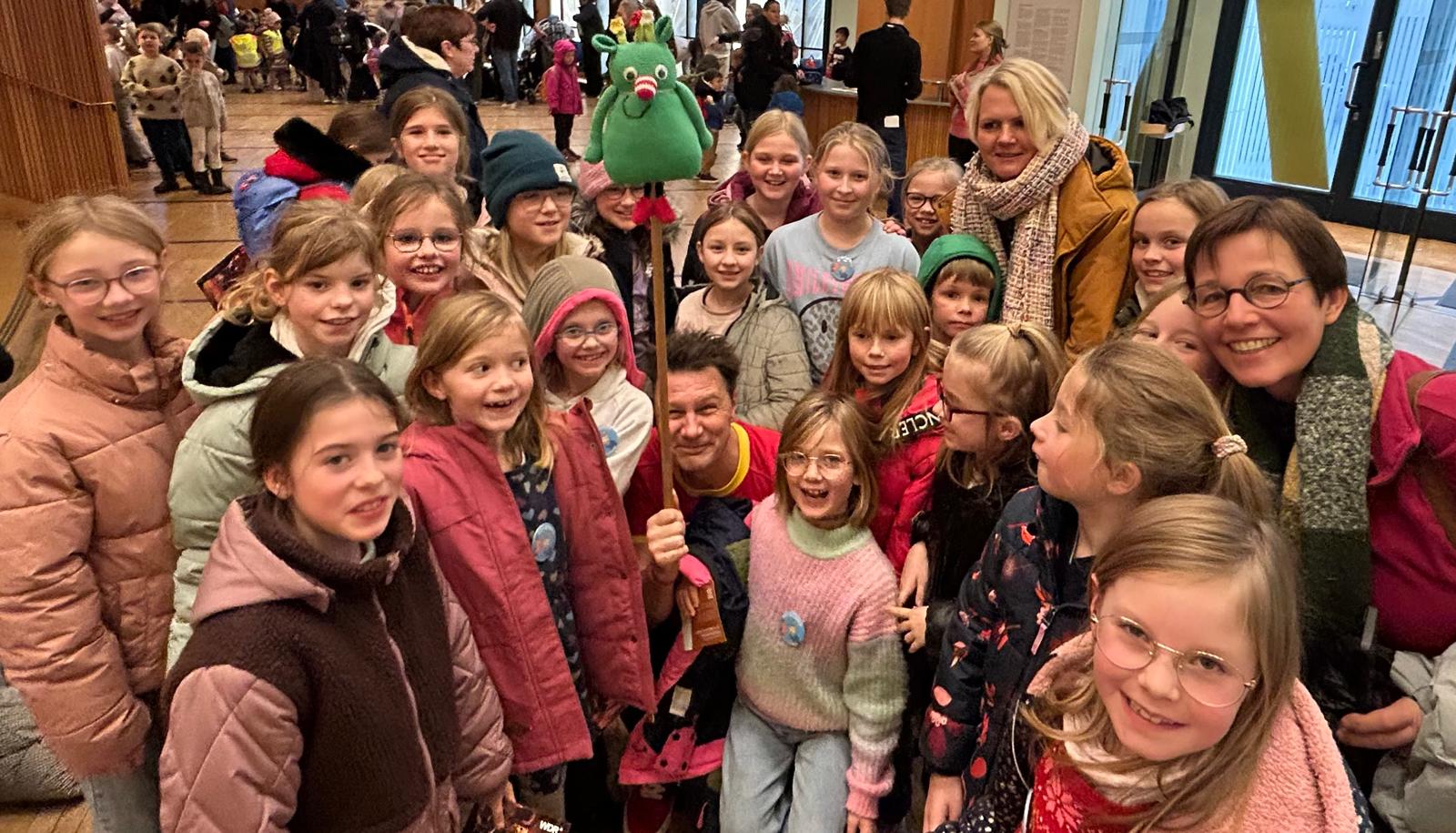 Die Klasse 2a hatte bereits seit November des vergangenen Jahres mit Angela Teigelkötter (Klassenlehrerin) und Kerstin Löffeler (Mitarbeiterin im Team der Schule) alles einstudiert, damit die Geschichte eindrucksvoll in Szene gesetzt werden konnte. Bei mehreren Generalproben durften zunächst die Schülerinnen und Schüler der Norbertschule in der eigenen Aula zuschauen. Schon hier war die Begeisterung allgegenwärtig.
